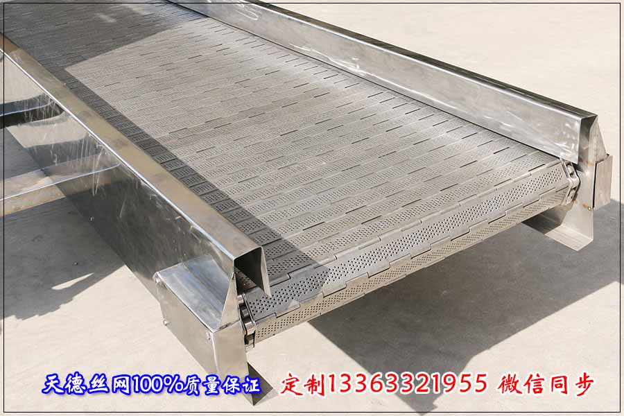 河北天德絲網制品有限公司生產不銹鋼輸送機、網帶輸送機、輸送鏈板、鏈板輸送機、加厚鏈板:13363321955