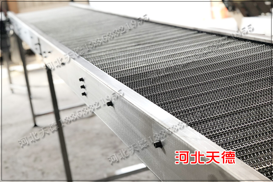 打撈水草使用的輸送機我們要采用不銹鋼304材質,網帶式爬坡不銹鋼輸送機我們要根據打撈的水草來定制具體的數據,這里我們為為客戶設計了一臺高度為半米,長度為五米,寬度為800毫米的輸送機,共計三臺。河北天德絲網公司為大家設計爬坡網帶輸送機,我們廠家保證能讓客戶購買到經濟實惠的性價比高的不銹鋼輸送機。