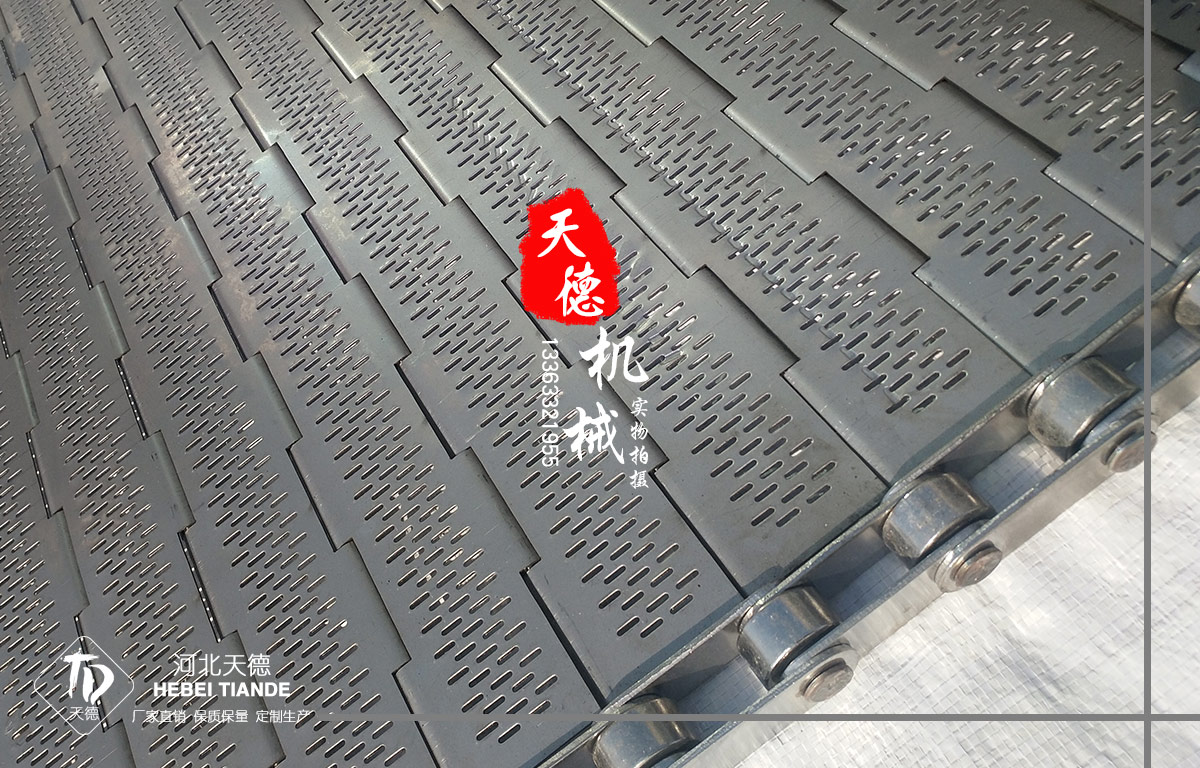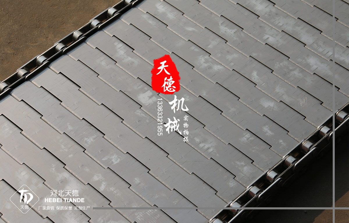 【鏈板輸送帶簡介】鏈板輸送帶非常堅固,鏈條驅動,用于中等和大負荷輸送。鋼板彎曲形成合葉,使用支軸將合葉和鏈條串在一起。兩端的鏈條可以使用開口銷或者墊圈來固定,使用開口銷方便拆卸,維護方便。