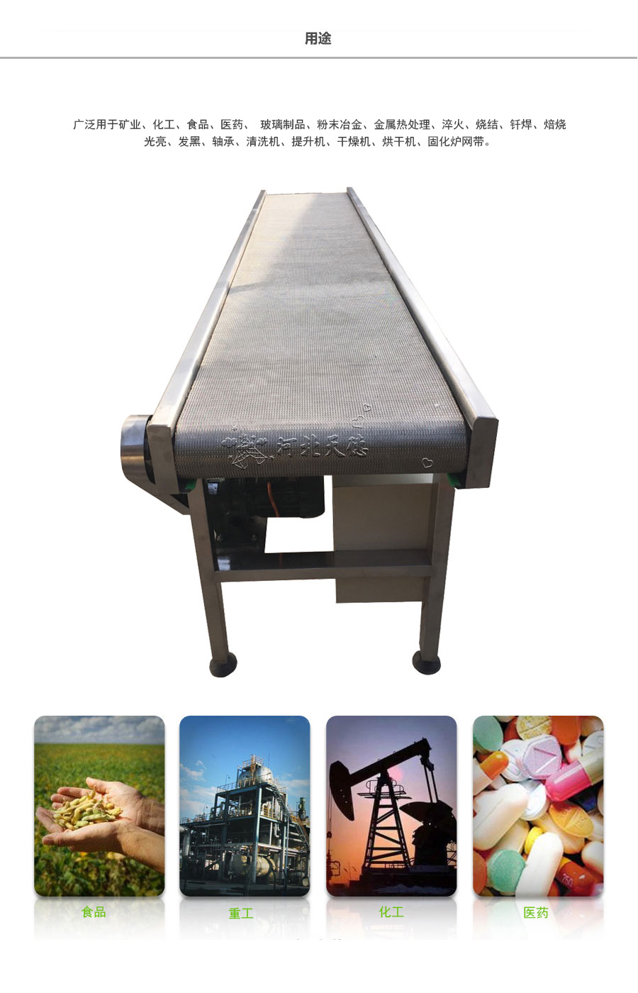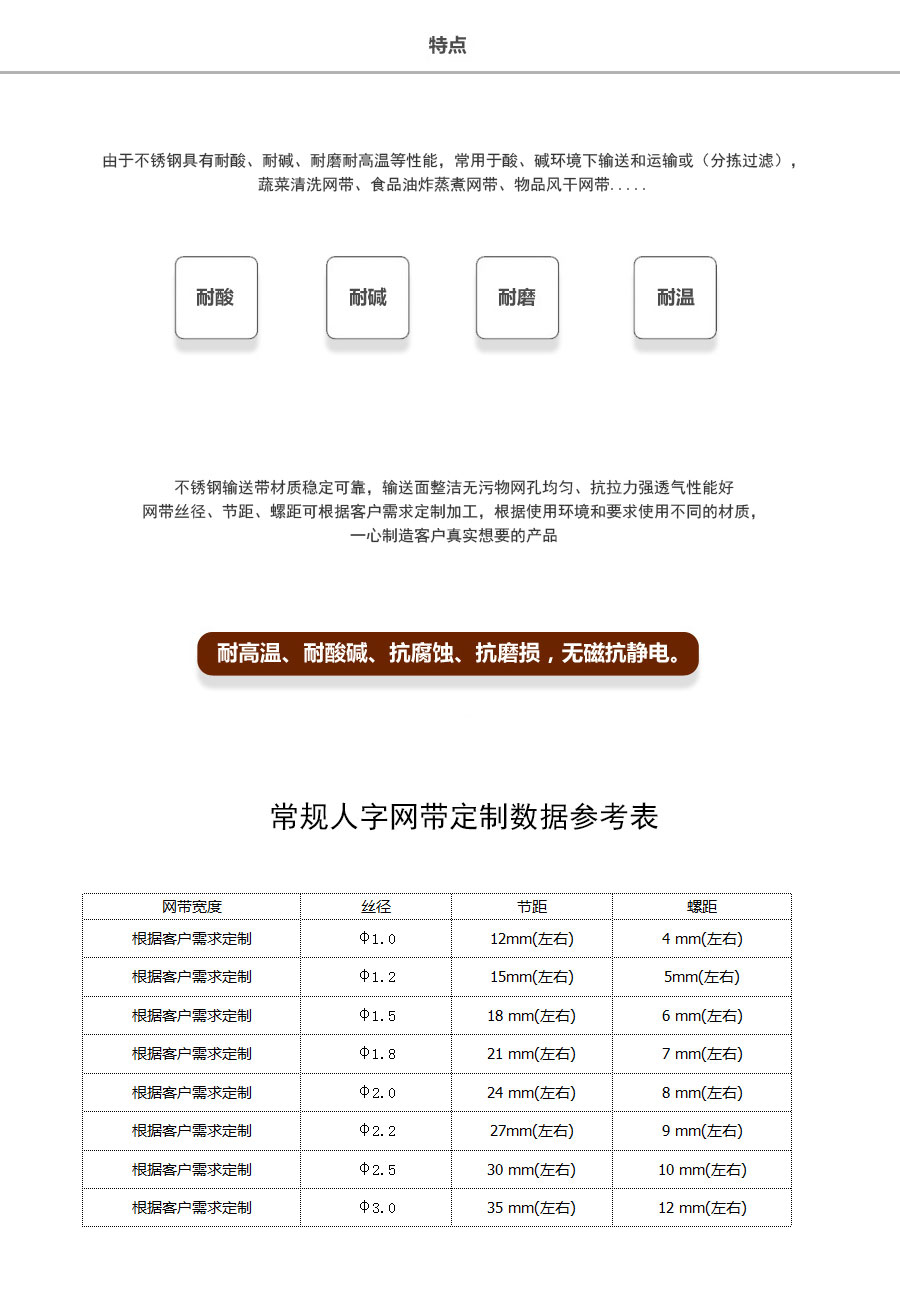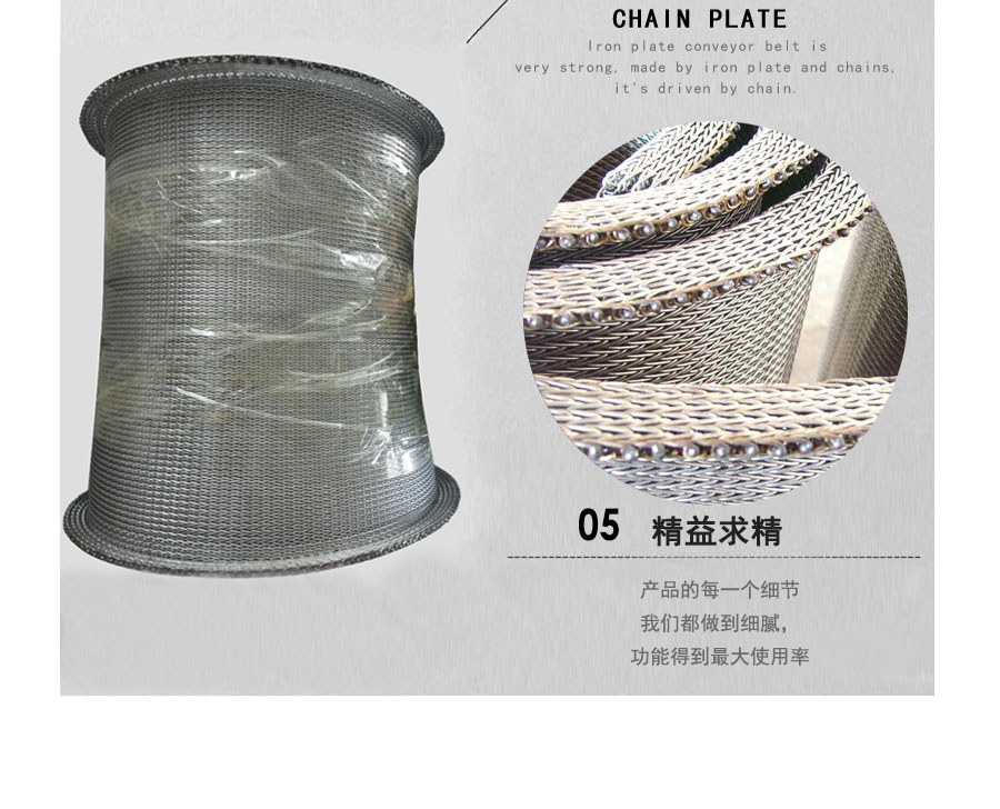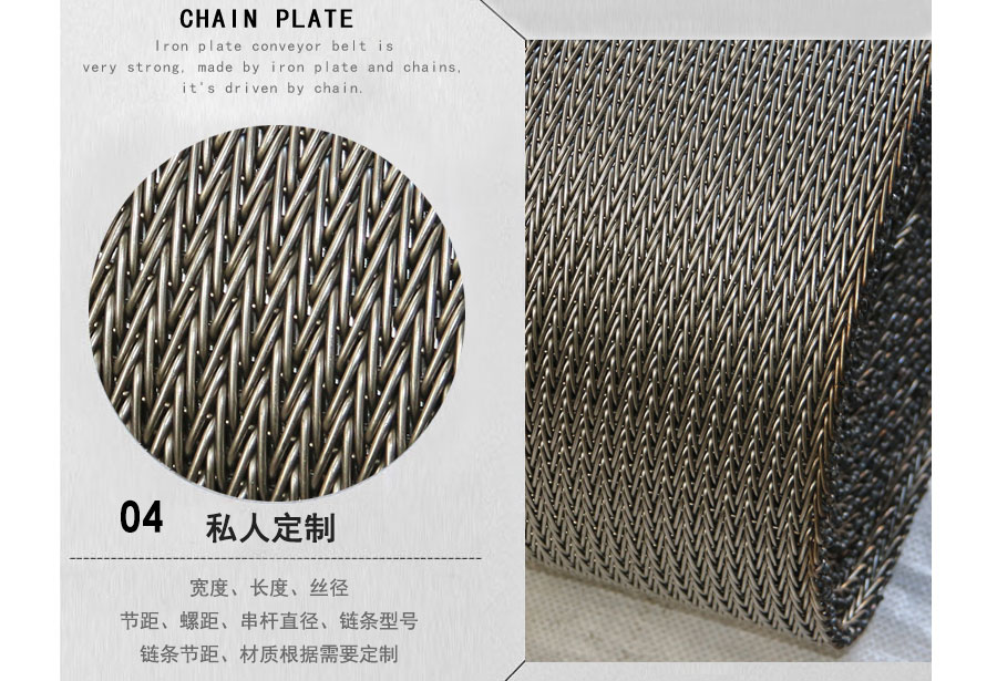人字形網帶應用:主要應用于食品烘干機、蔬菜、海產品清洗機,巴氏機,方便面米粉蒸煮、熱收縮膜包裝機。玻璃瓶罐、食品、燈炮、金屬、器皿、化纖、印染、醫藥、電子、粉末冶金、熱處理、木材、物流輸送等各行業自動裝置和自動流水線的使用;焦爐煤氣及電子紅外線等各種窯爐系統的傳動使用等食品機械,玻璃機械,輸送機械。
